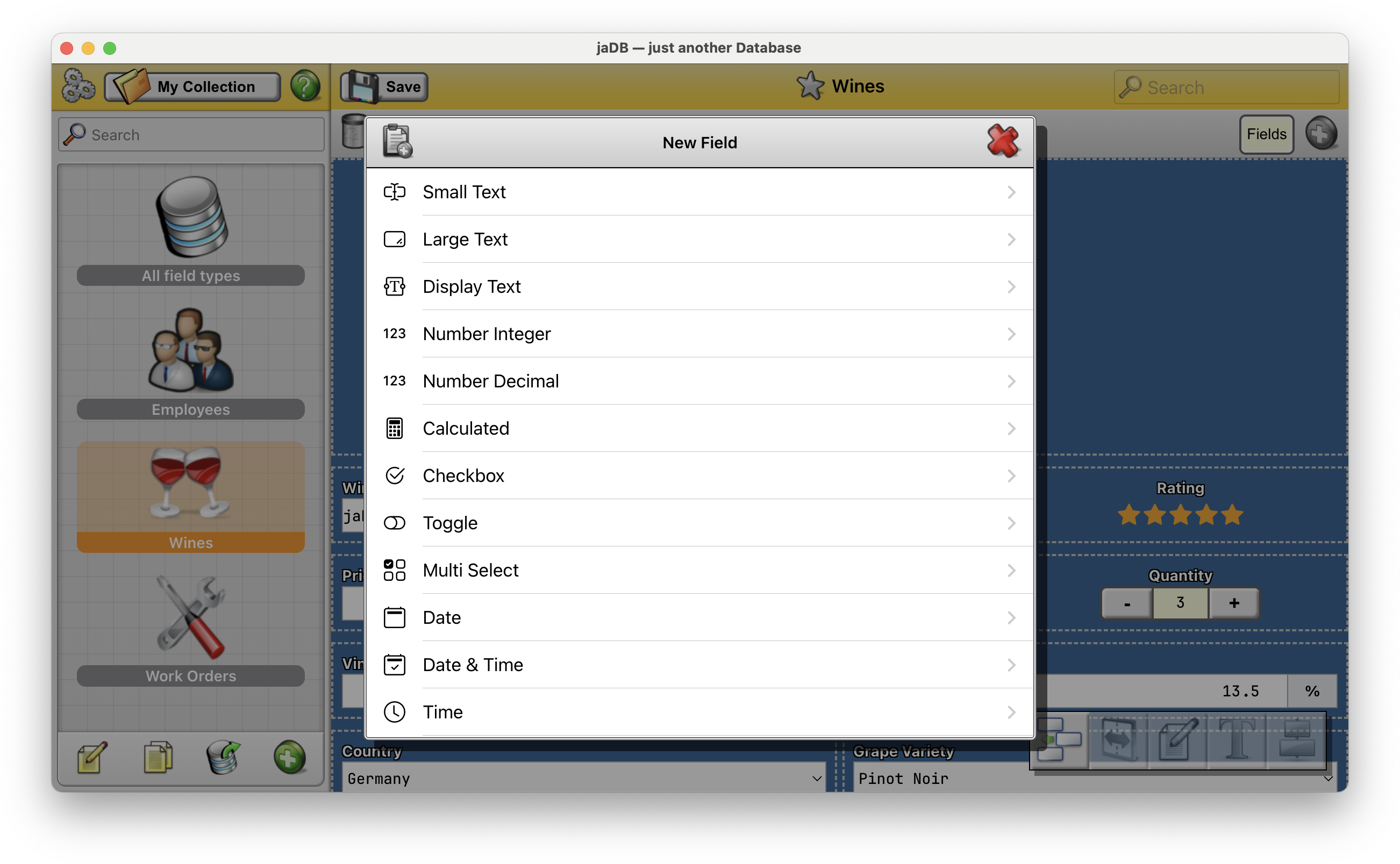 - 20 different field types: ID, Small Text, Large Text, Number Integer, Number Decimal, Calculated, Checkbox, Toggle, Multi Select, Date, Date & Time, Time, Dropdown, Stepper, Slider, Rating, Phone, Email, Image, Creation Time, Modification Time